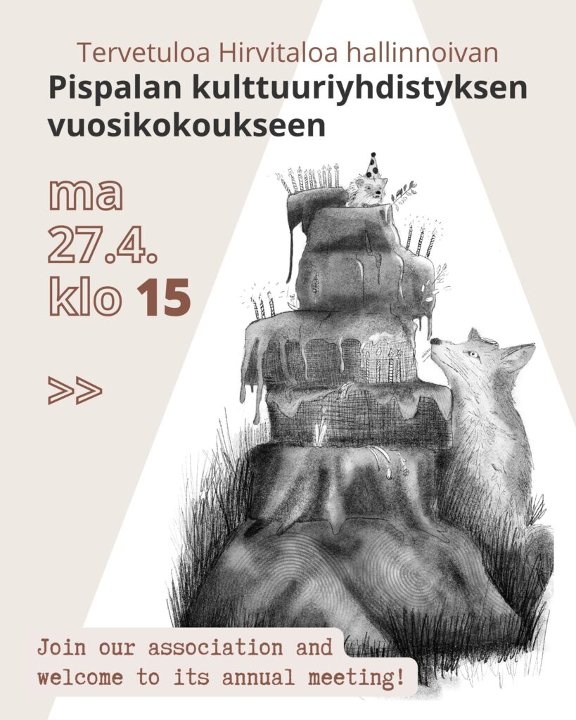 WELCOME to the annual meeting of the Pispala Cultural Association, which runs Hirvitalo! We meet on Monday 27.4. starting at 3pm.