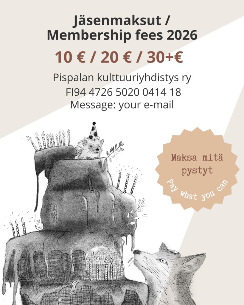 Remember to pay your membership fee before the meeting! By becoming a member you get to vote in the meeting, and it’s also a good way to support the continuity of Hirvitalo.