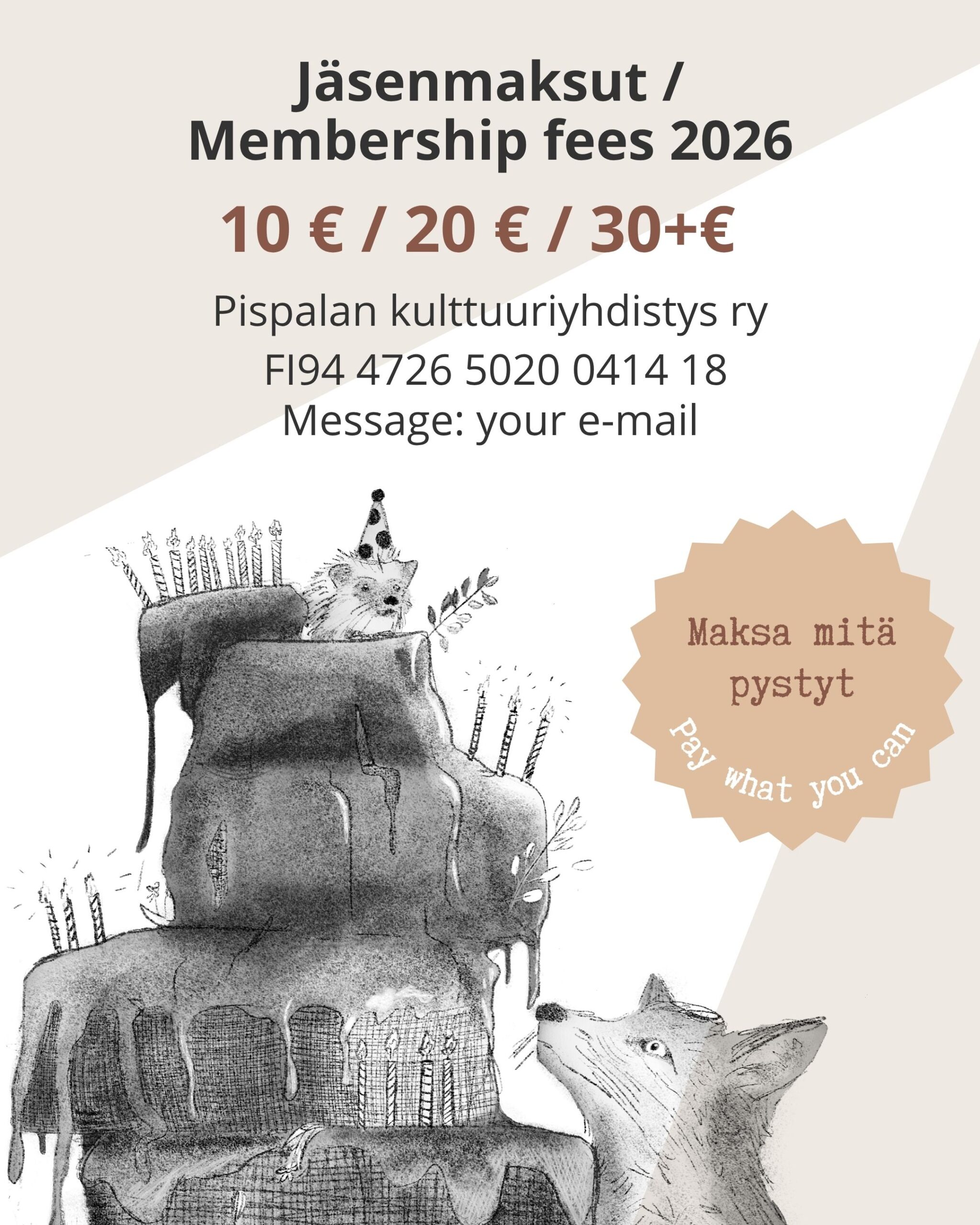 Viestiksi: jäsenmaksu & sähköpostiosoite, johon haluat jäsenpostia (jos haluat)