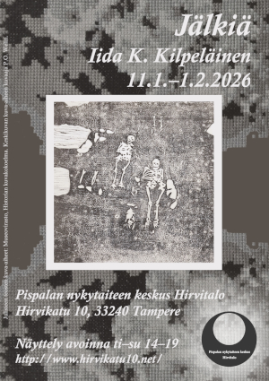 Hirvitalon yläkerrassa on 11.1.-1.2.2026 esillä Iida K. Kilpeläisen näyttely Jälkiä. Teoksissa varioidaan arkistoista löydettyjä kuva-aiheita ja esitetään ajallisia prosesseja taidegrafiikan ja kirjonnan menetelmillä. Kokonaisuus koostuu osin installaatiomuotoisesta kohopainografiikasta, ristispistotöistä sekä puupiirrosanimaatiosta, jonka kohiseva ääniraita on tulkittu kuvatiedostoista.