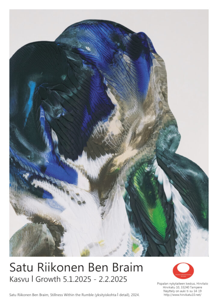 5.1.2025 Avautuu Pispalan nykytaiteen keskuksella, Hirvitalolla, Satu Riikonen Ben Braimin yksityisnäyttely Kasvu l Growth ja se on auki aina 2.2.2025 saakka. Näyttelyssä on esillä lasi- ja tekstiiliveistoksia, akryylimonotypioita, sekä tilaan levittyviä installaatioita. Näyttelyssä taiteilija tutkii kasvua niin biologisesta kuin psykologisestakin näkökulmasta ja sen luonnetta välillä hiljaa, vähitellen ja aikojen saatossa lopulta kaiken muuttavana voimana. Näyttelyssä taiteilija itse kasvattaa uuden ehdotuksen tilasta ja sen todellisuudesta ja samalla herättää kysymyksiä ihmisen roolista ympäröivässä maailmassaan suojelijana, tekijänä, muodon antajana ja puutarhurina.