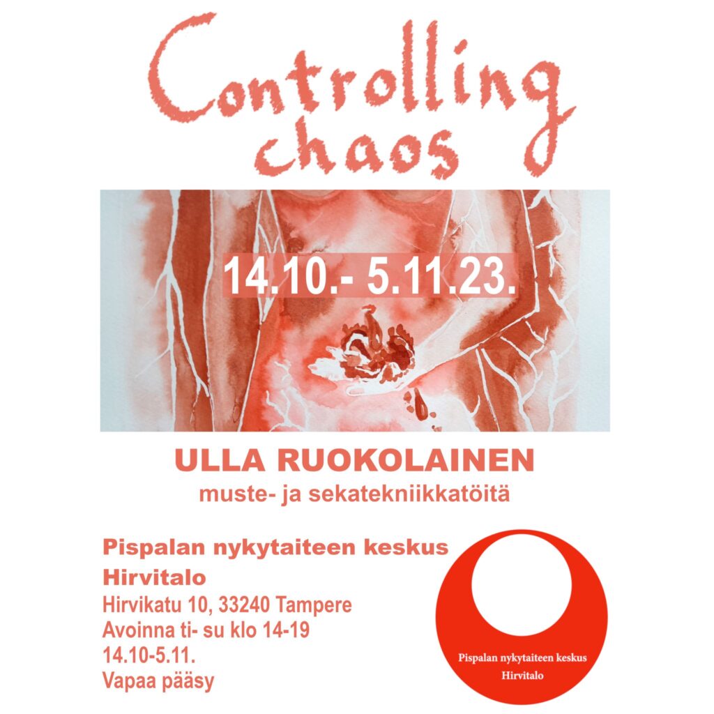 Controlling chaos on Ulla Ruokolaisen kolmas yksityisnäyttely. Hän on valmistunut muotoilijaksi vaatesuunnittelun koulutusojelmasta Pohjois-Karjalan ammattikorkeakoulusta, mutta kiinnostunut viime vuosina enemmän muista visuaalisista taiteista.