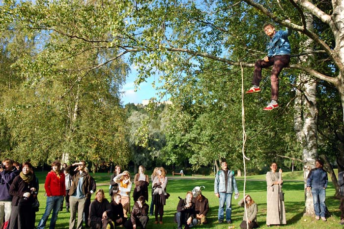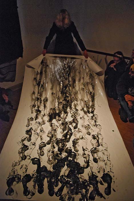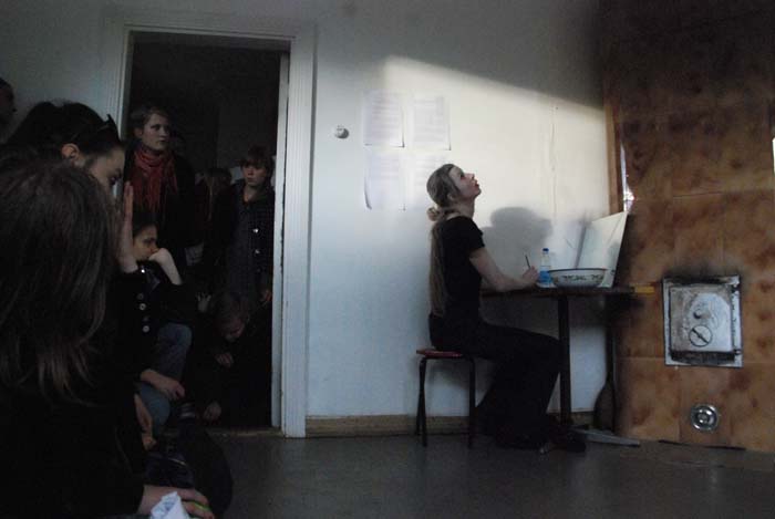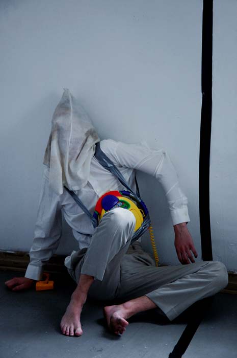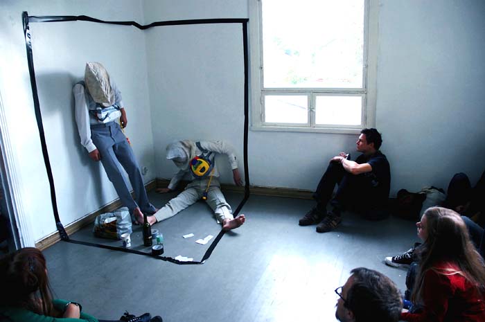 Huoneesta on teipillä rajattu alue. Me olemme sen sisällä ja kiinnitämme itsemme seinään. On vaikea liikkua. Meidän päät on peitetty ja olemme siinä seinällä, rinnassa teipattuna pommi. Lattialla on jotain lappuja. Välillä laulamme tai lausumme, mutta suurimman osan ajasta pitää olla hiljaa. Lopuksi meidän on revittävä itsemme irti. Tämä toistuu useamman kerran.