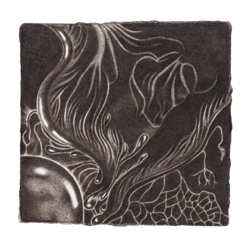 The exhibition features monochromatic coloured pencil drawings, watercolor and ink paintings, and small sculptures. The works intersect with observations and elements related to different kinds of views, landscapes, and times. They zoom in on the details of real, imagined and remembered places, such as rocks, fossils and mycelium in the soil, as well as the patterns of animal fur and skin.