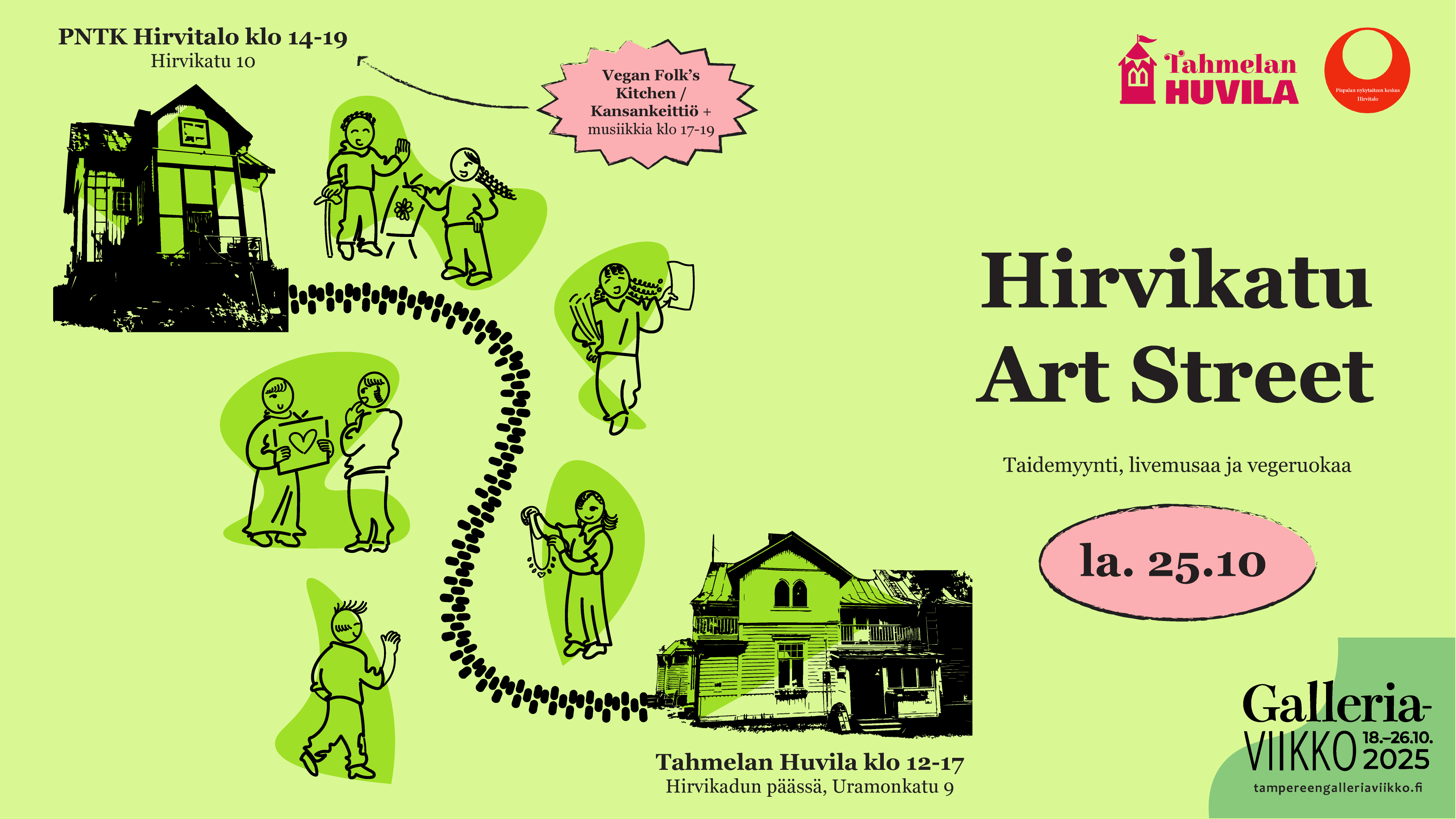 Hirvikatu Art Street la 25.10. yhdistää Hirvitalon ja Tahmelan Huvilan taiteilijat yhteen. Taidemyyntiä, livemusaa ja vegeruokaa tarjolla. Tule hakemaan joululahjat pukin konttiin!