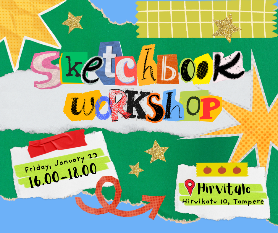Työpaja on avoin kaikille luoville sieluille: taiteilijoille, opiskelijoille, harrastajille! Työpaja on englanninkielinen. Teemme ohjattuja harjoituksia ja annamme luovuuden kukoistaa kaikissa väreissään! Hirvitalolla on taidetarvikkeita, mutta osallistujien on tuotava omat luonnoskirjat, sekä mieluusti liimaa ja sakset.